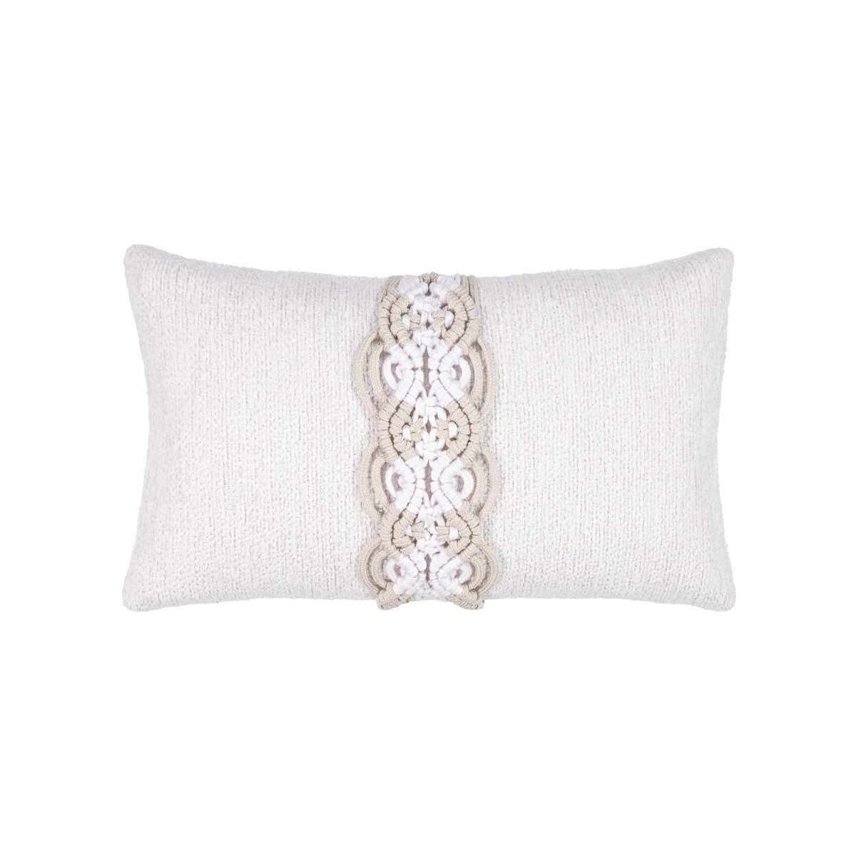 Combining varieties of the finest chenille yarns in natural hues, Distinction features a hand-braided, macrame centerpiece woven in two colors by our team of skilled artisans. This luxury pillow can be used indoors as well as outside.