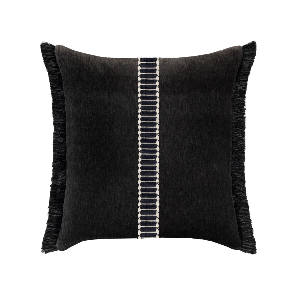 An intricate center band divides this soft, huggable pillow in classic charcoal velvet. The subtle shading in the fringe gives this pillow a luxe design with a plush feel in a monochromatic palette.